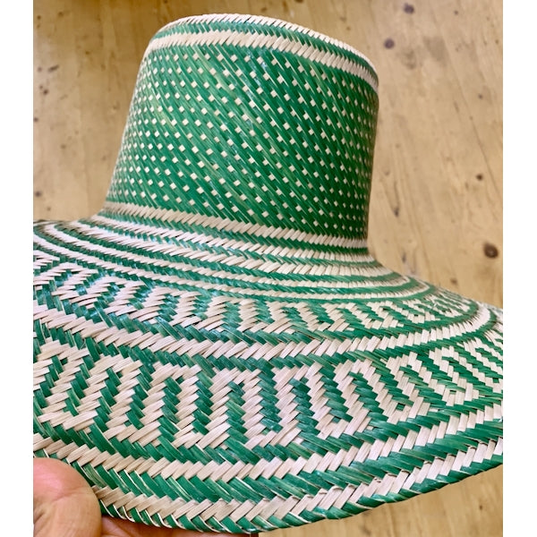 Hand woven ttraditional Wayuu hat. Super strong flat top and beautiful designs. 12 cm brim width. These hats are worn by the indigenous people who live in the Colombian desert. Ethically traded supporting the indigenous artisans.