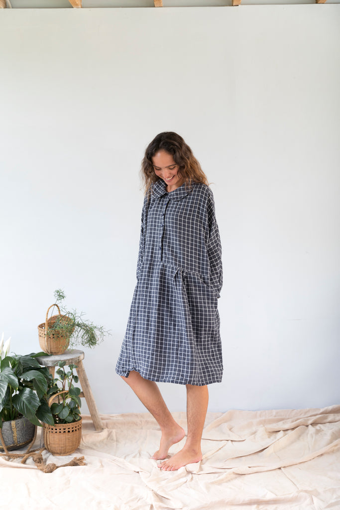 Soft, timeless, and effortlessly wearable — this navy check dress is made from breathable 100% French linen, featuring a relaxed fit with gentle gathers at the waist for everyday ease. The charming Peter Pan collar adds a touch of vintage sweetness, while the full-length sleeves and side pockets keep it practical and cosy for cool days.
