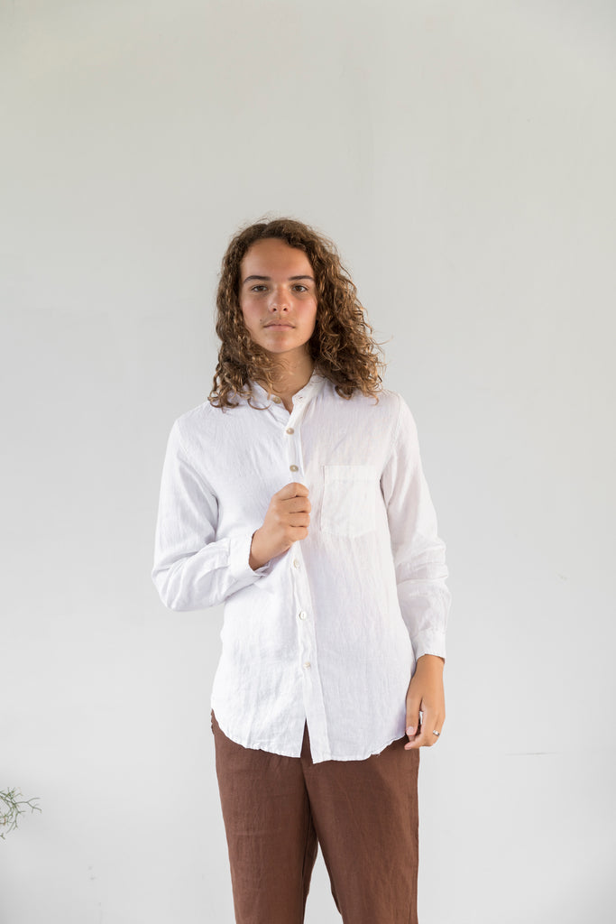A beautiful shirt featuring a mandarin band style collar and cuff details. Made from our 100% prewashed french linen. It comes in classic white and light blue chambray.