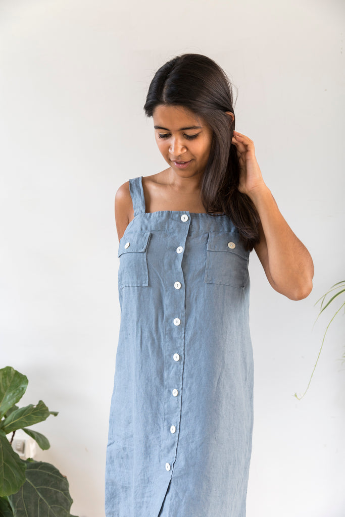 A playful retro style mini shift featuring small front patch pockets and button shoulder straps. Fun and fresh, this shift is perfect for summer. It comes in 3 colourways; Sound Wave Check, Antique White and Marine Blue.