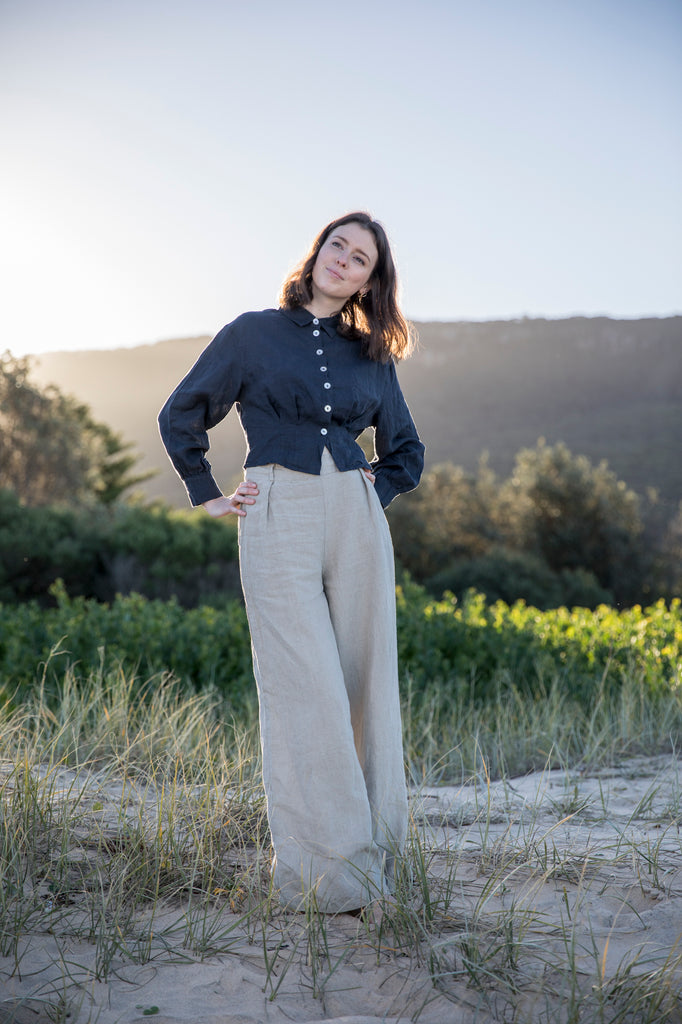 High waist linen pants featuring side pockets, front darts, wide legs and side zip. Both the chocolate and the natural pants can be coupled with our linen jacket to make a chic, easy care linen suit.