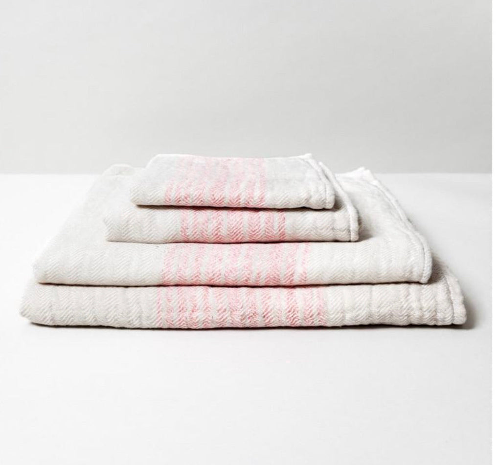 Made from Japanese Imabari organic cotton and are woven with a very delicate chevron pattern, and a striped border on one end. They have two sides: an ultra-soft cotton flat weave and a terrycloth pile on the other side.