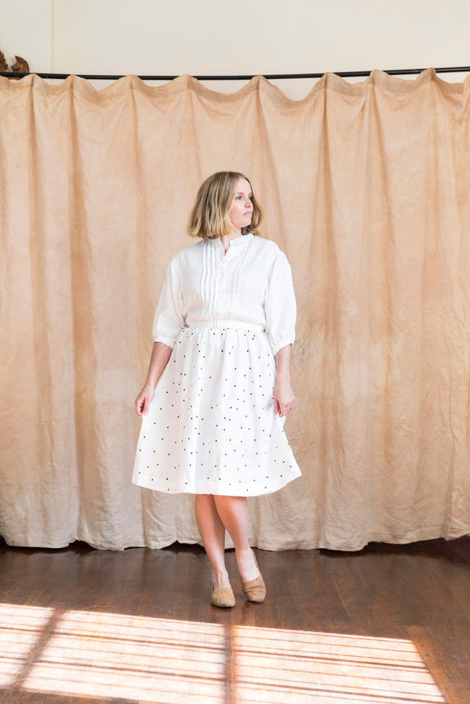 A classic white linen skirt featuring a soft gathered waist and embroidered polka dots in Navy cotton. Has side pockets. Navy button waist. Pairs with the beautiful Luna shirt with puff sleeves and pin tucks.