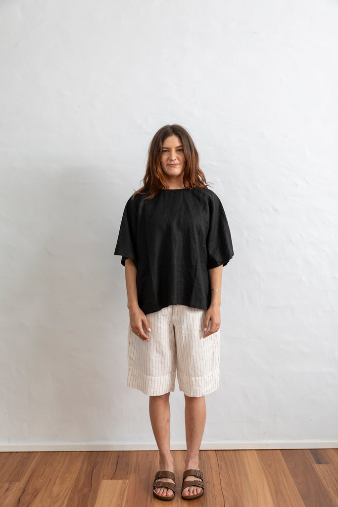 Linen shirt featuring a button through back with a round neck line. Loose fitting with elbow length sleeves. It comes in One Size measuring 65cm in width (130cm) across chest and 62cm (124cm) at the hem. 65cm in length.