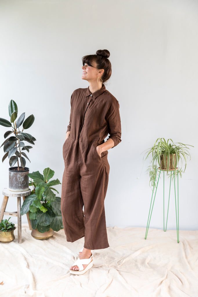 Utilitarian meets femininity. Seriously stylish, our French linen boiler suit is a statement piece with functionality and comfort. Featuring three quarter length sleeves, button front, waist tie with elastic back and side pockets.