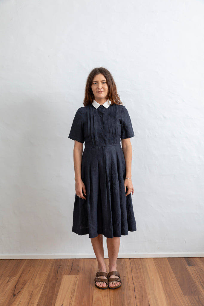 Midi length linen dress. Features include a contrast white collar, pin tuck front, fitted waist and gently pleated skirt. The dress is fabricated from 100 % french flax linen.