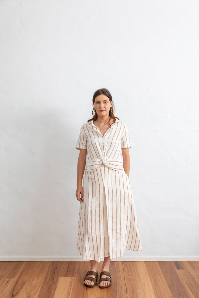 A maxi length A line skirt featuring a front pleat and side pockets. Made from 100% french flax linen. The skirt comes in two colour ways, Navy and cinnamon pinstripe.