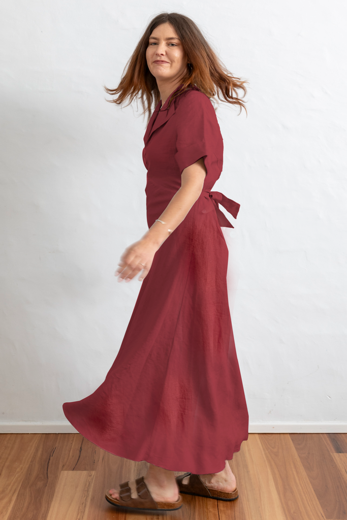The Julietta Dress has been inspired by 1980's fashion. A flattering retro classic loose fitted , but shapely dress. Cut on the bias it has a beautiful fall. It features deep cuff sleeves, vintage lapel collar and is made in navy linen. It also comes in pinstripe.