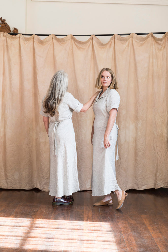 The Julietta Dress has been inspired by 1980's fashion. A truly flattering classic loose fitted , but shapely dress. Cut on the bias it has a beautiful fall. It features deep cuff sleeves, vintage lapel collar and is made from pinstripe linen.