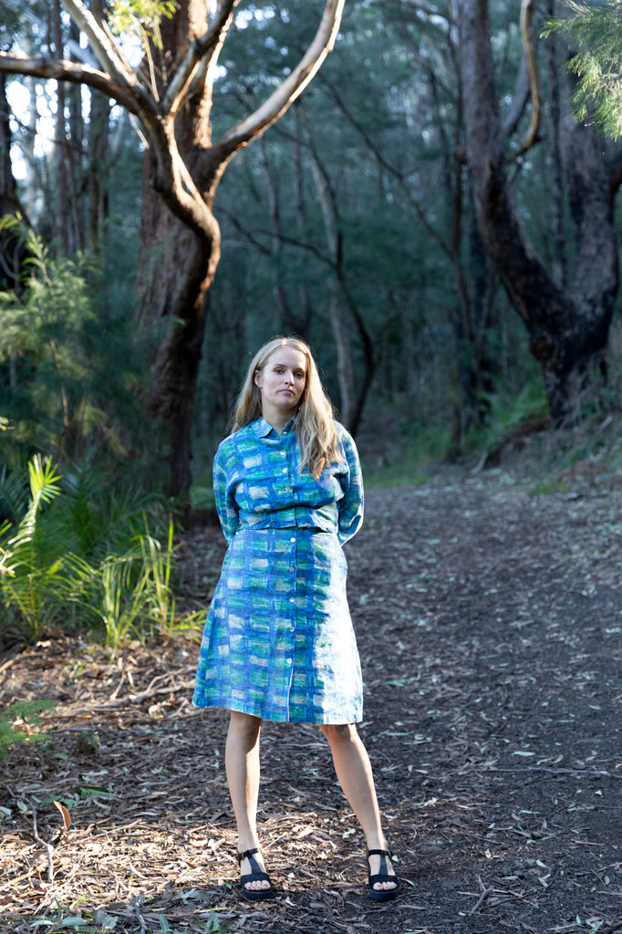 A beautiful structured shirt with strict tailoring. This shirt has wide dropped sleeves with a little gather at cuff and has a tailored waist. This shirt features a mid-century inspired retro check print with blue, beige and green tones. It can be coupled with our A-line skirt to make a chic suit. The shirt can also be worn as an open short style jacket.