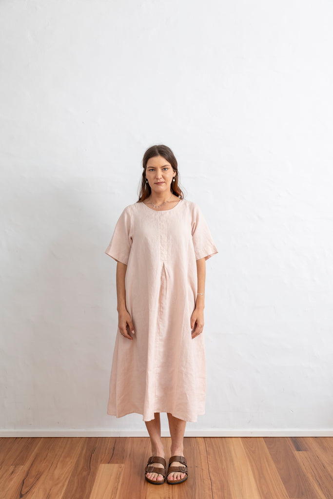 It has a scoop neck with a front pleat. Side pockets and boxy sleeves. This dress is fitted across shoulders and chest. The pleat is lower on the chest giving a beatiful flow and shape. The dress comes as both a tunic and a sleeved dress. The dress can be worn alone or interseasonal with layers.